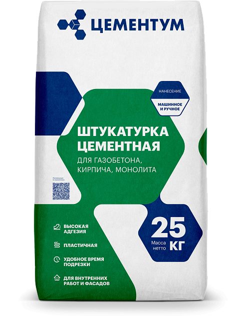 ЦЕМЕНТУМ - Штукатурка цементная применяется для восстановления, выравнивания и оштукатуривания поверхностей внутри и снаружи зданий, выполненных из кирпича, бетона, ячеистого бетона (пенобетон, газобетон), цементно-песчаной, цементно-известковых штукатурки и других материалов на минеральной основе. Штукатурка может наноситься как ручным, так и механизированным способом. За одну смену можно наносить слой до 60 мм с помощью штукатурной машинки, вручную — до 30 мм и до 60 мм при многослойном нанесении.
